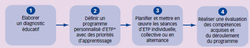 L’accès du patient au programme est réalisé sur proposition d’un professionnel de santé ou en accès direct. La planification de la démarche éducative suit 4 étapes qui conduisent à l’élaboration du programme :